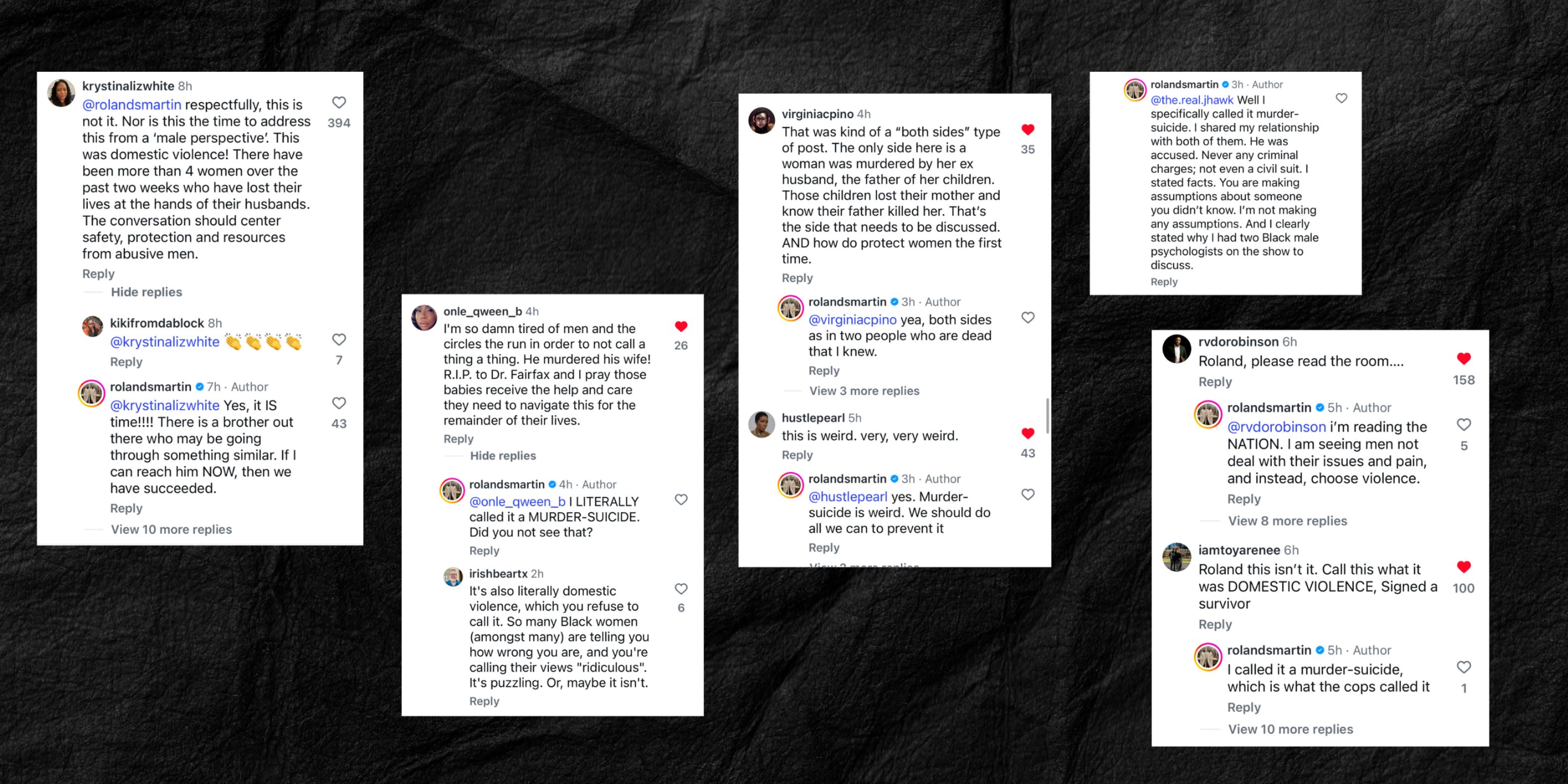 If you read Roland’s post without having read the story, you may have thought that Justin was murdered by someone else, or even was the victim. Through comments, Roland doubled down on his defense of the post, stating that Black men’s mental health is important - and it is - but to use a moment where a man has just deliberately made the choice to kill his wife while his children were next door sounds the same as those who excuse mass shooters actions under the guise of mental health. Take it from the experts, mental illness isn’t the driving factor behind domestic violence, and to indicate so allows for men to isolate themselves from the idea that domestic violence is a choice that they or their friends or coworkers make. It’s also important to note that most mentally ill people are not violent. According to a study by the Violence Policy Center, they found that “Black women were two and a half times more likely to be murdered by men than their White counterparts [and that] nine in ten Black female victims knew their killers.” Black women are at risk and largely by the men they know, regular everyday men.