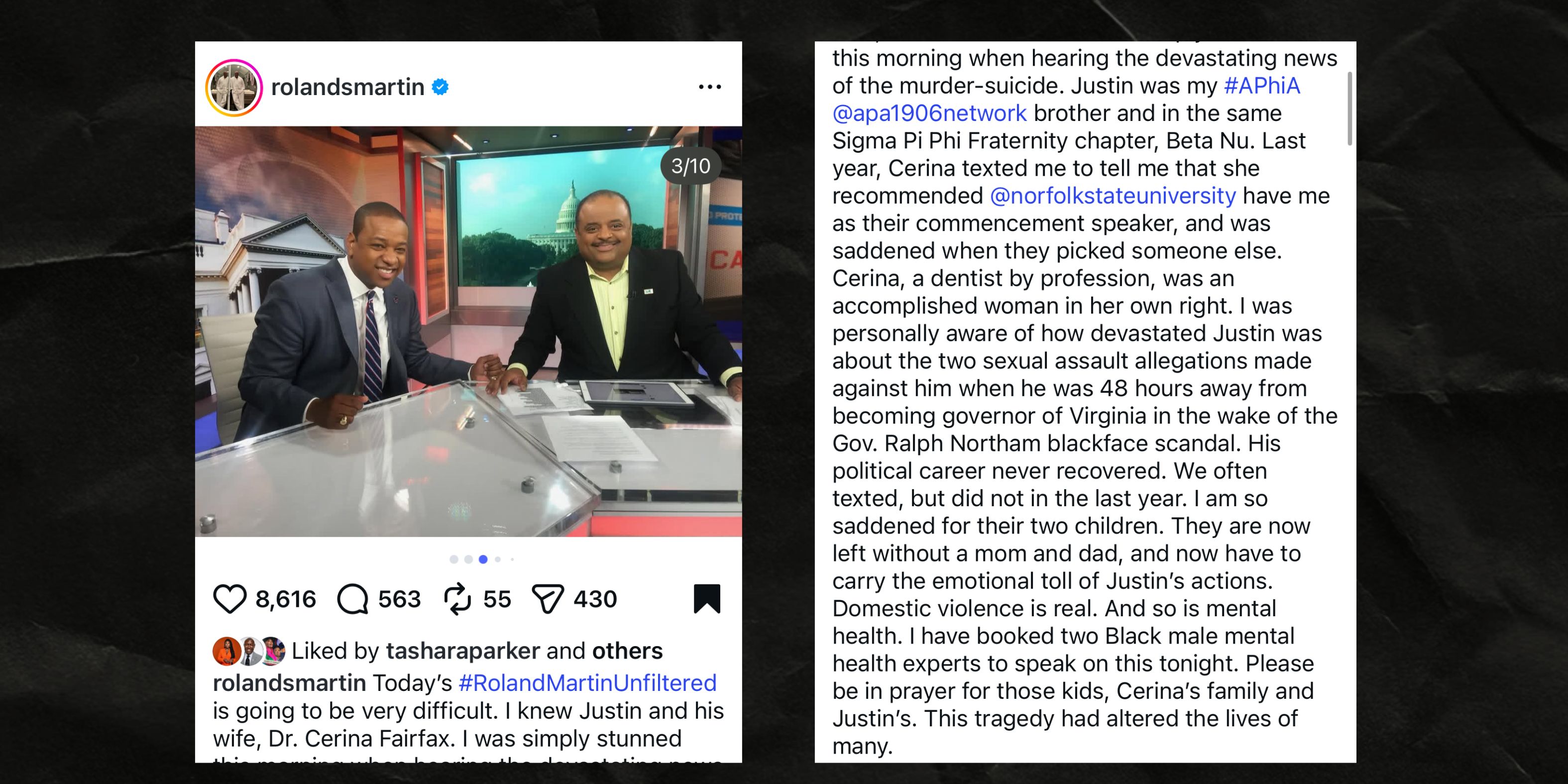 Multiple Black women have lost their lives the last few weeks in high profile domestic violence cases. One of the most recent ones broke something new in me - the murder suicide of Dr. Cerina Fairfax by her husband and disgraced politician Justin Fairfax. A few aspects of the case in particular hurt more than most - Justin shot Cerina, then himself while the kids were home. One of their teenagers found their mom within minutes of her being shot and called 911. In the call transcript the teen describes his mom as “having holes in her shirt” and “[potentially being] stabbed by his dad.” As if this wasn’t bad enough, coming online showed me that Black men everywhere were not only mourning his loss and sharing their selfies with him, but framing his death as an uncontrollable circumstance. The posts made my stomach turn. In a now deleted Instagram post, Roland Martin shared that Justin was “[his] #APhiA @apa1906network brother and in the same Sigma Pi Phi Fraternity chapter, Beta Nu.”